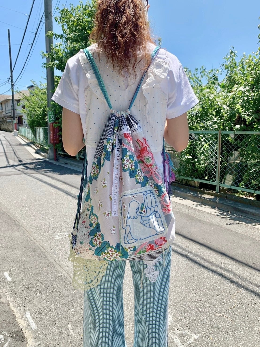 集めてきたヴィンテージの布やレース、ハンカチたちをふんだんに使ってすこし大きめのナップサックに仕立てました✴︎