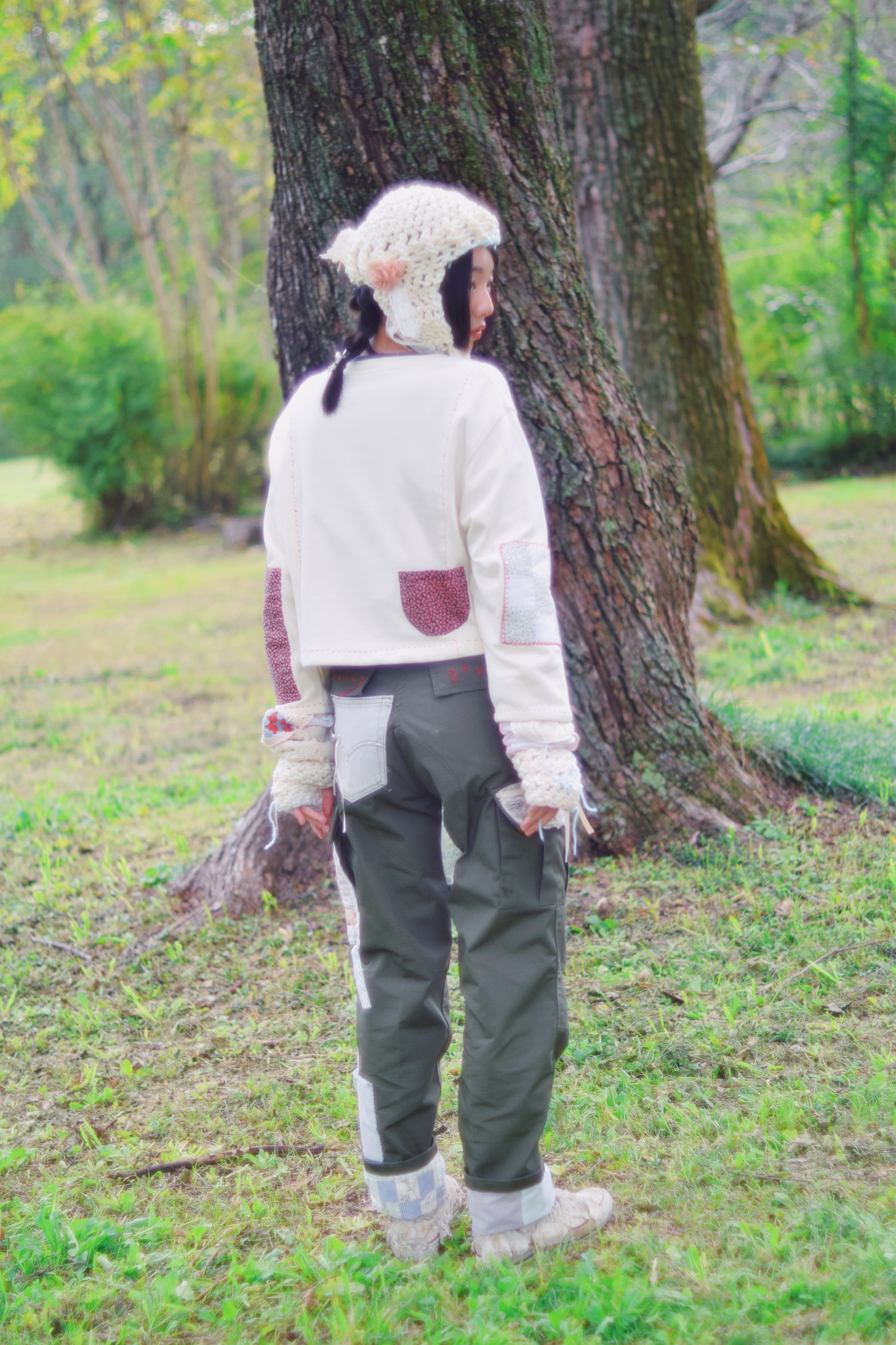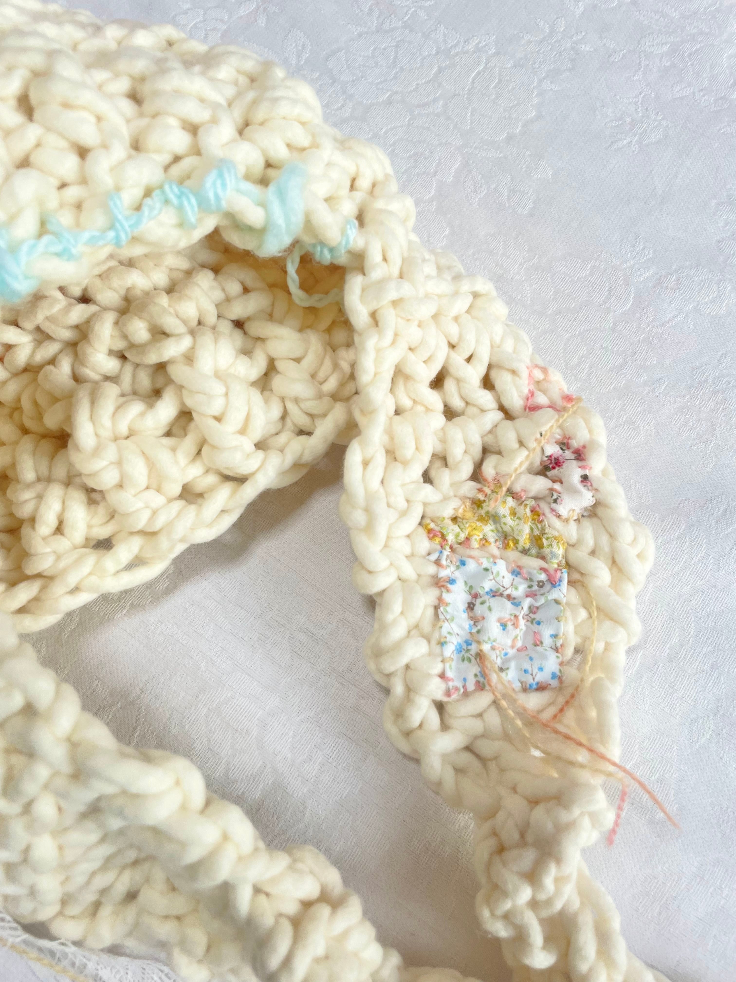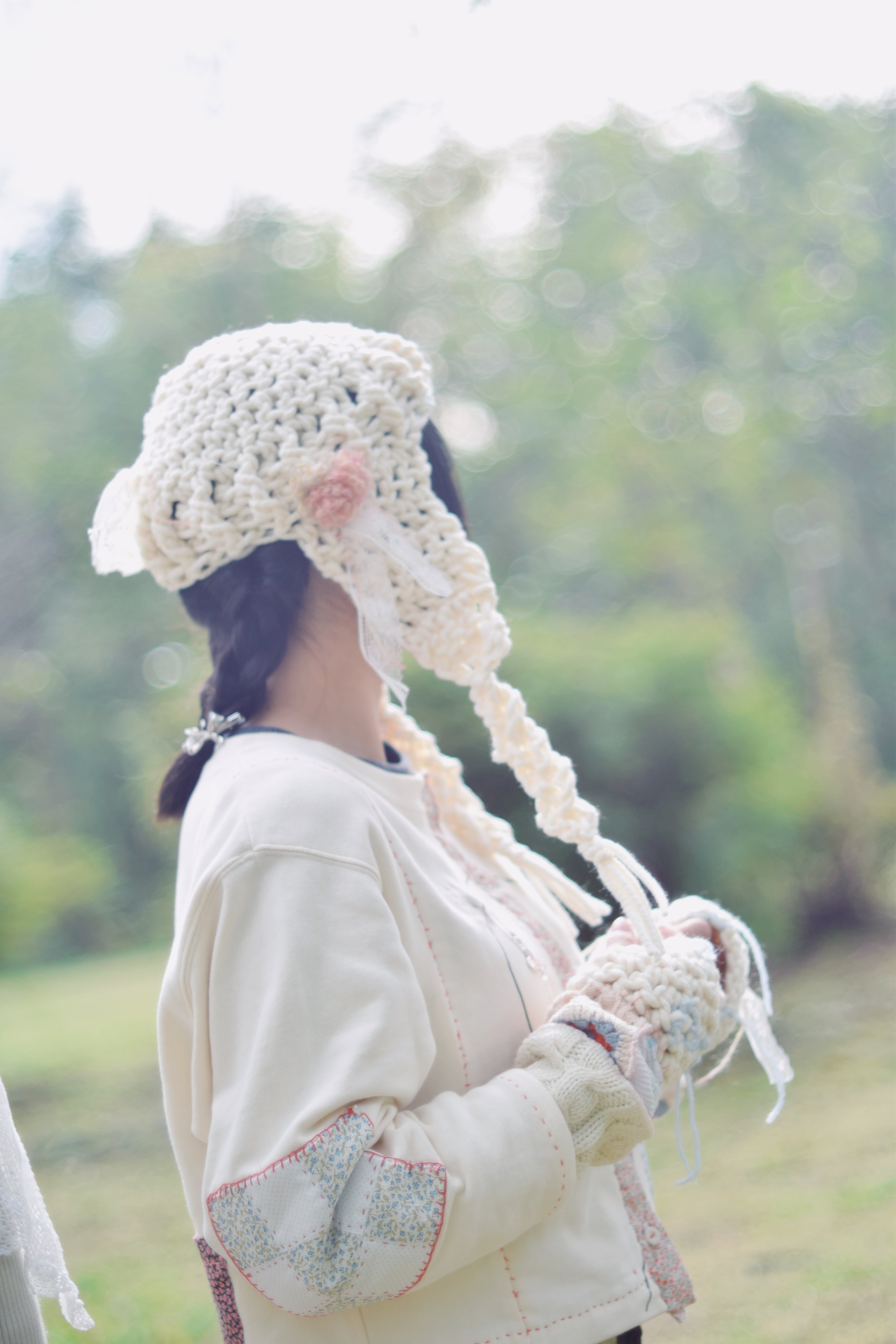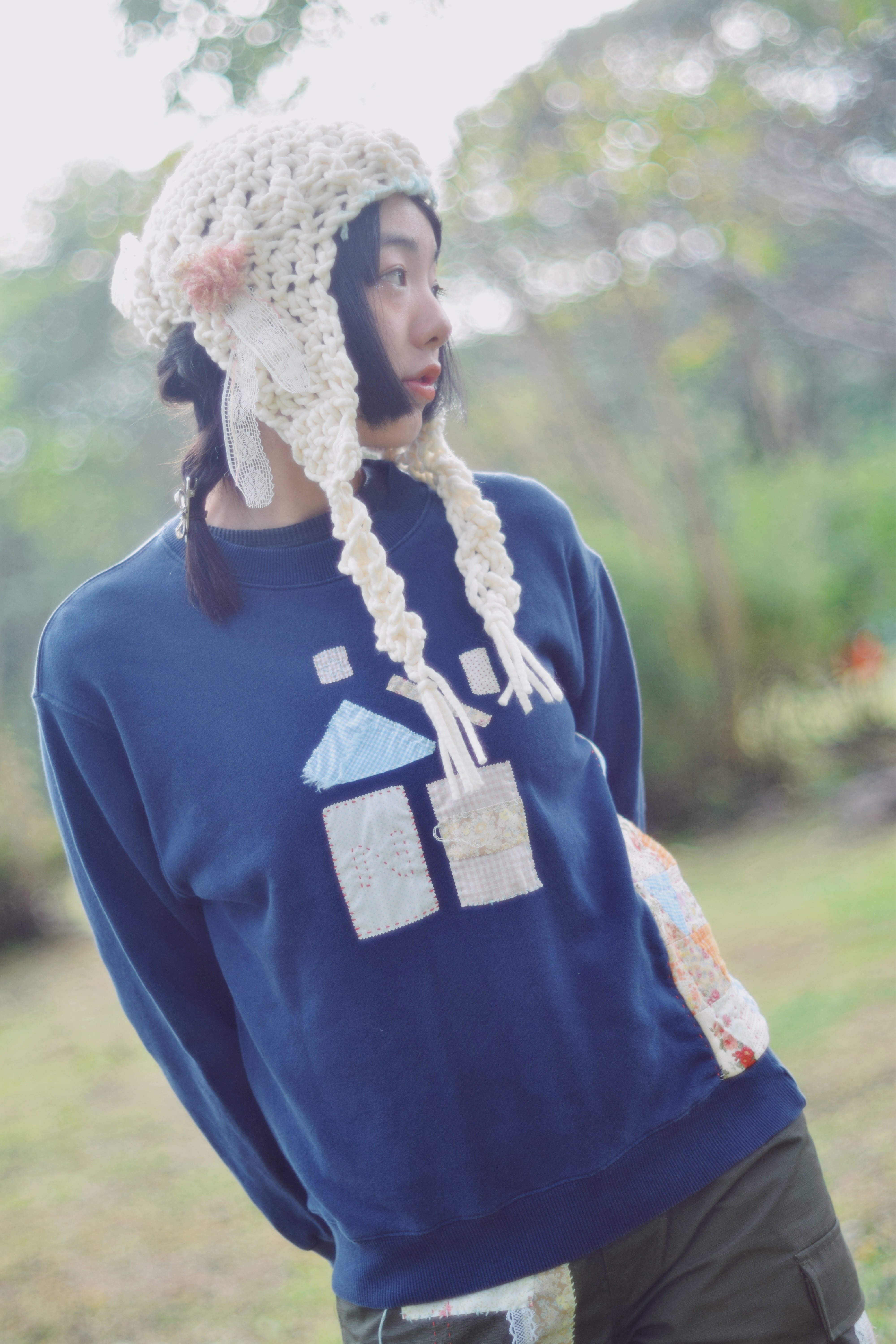 レースやお花でガーリーな一面、水色のおんぷの刺繍やステッチ、左耳当て部分の家のパッチワークなど、カジュアルな遊びごころもあり、ガーリーにもカジュアルにも合わせやすいと思います♩