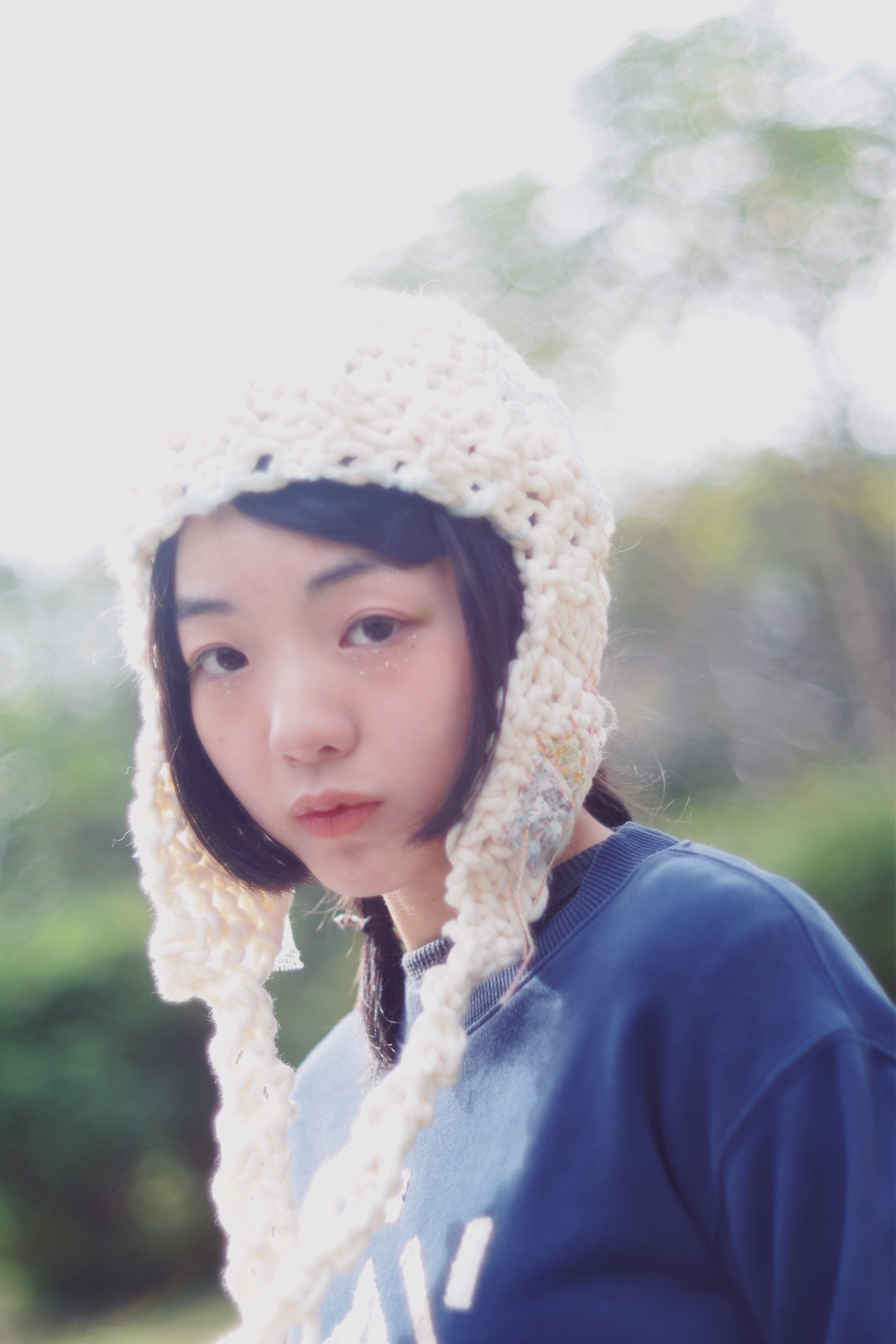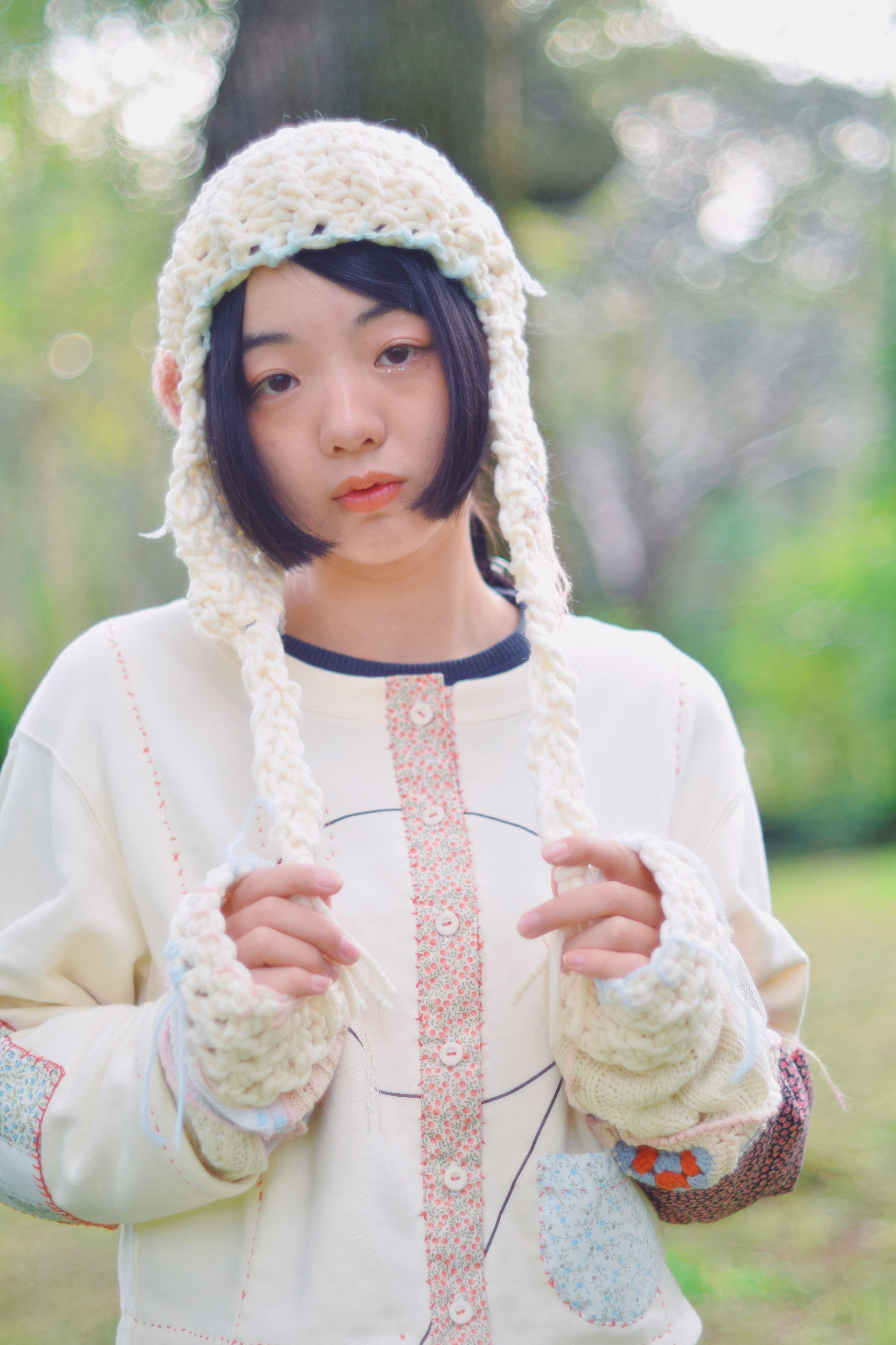 耳当てもついてあたたかく、糸自体の弾力がありボリューミーなニット帽にnon≒senceの代名詞みつあみをたらして仕立てています♩