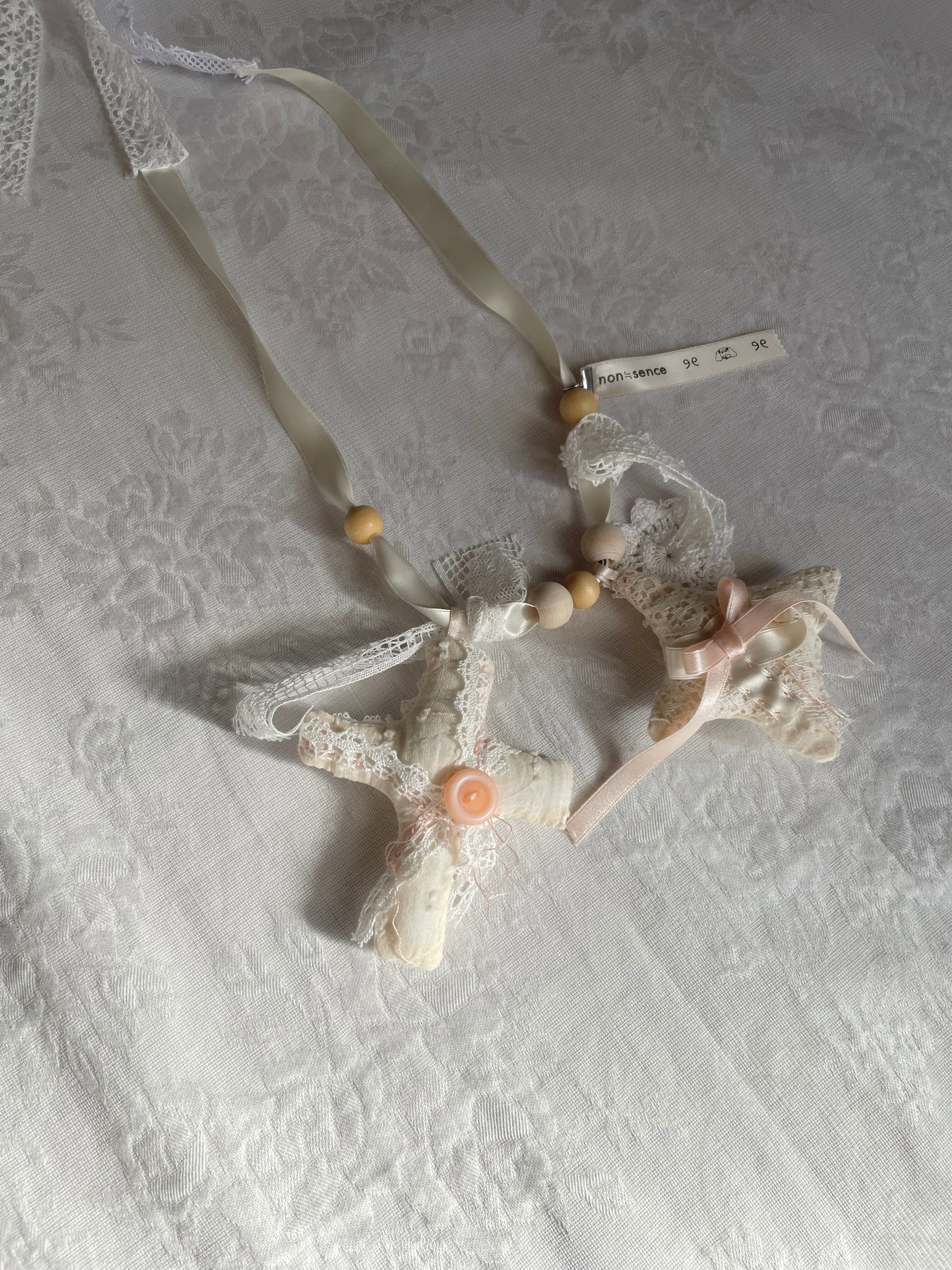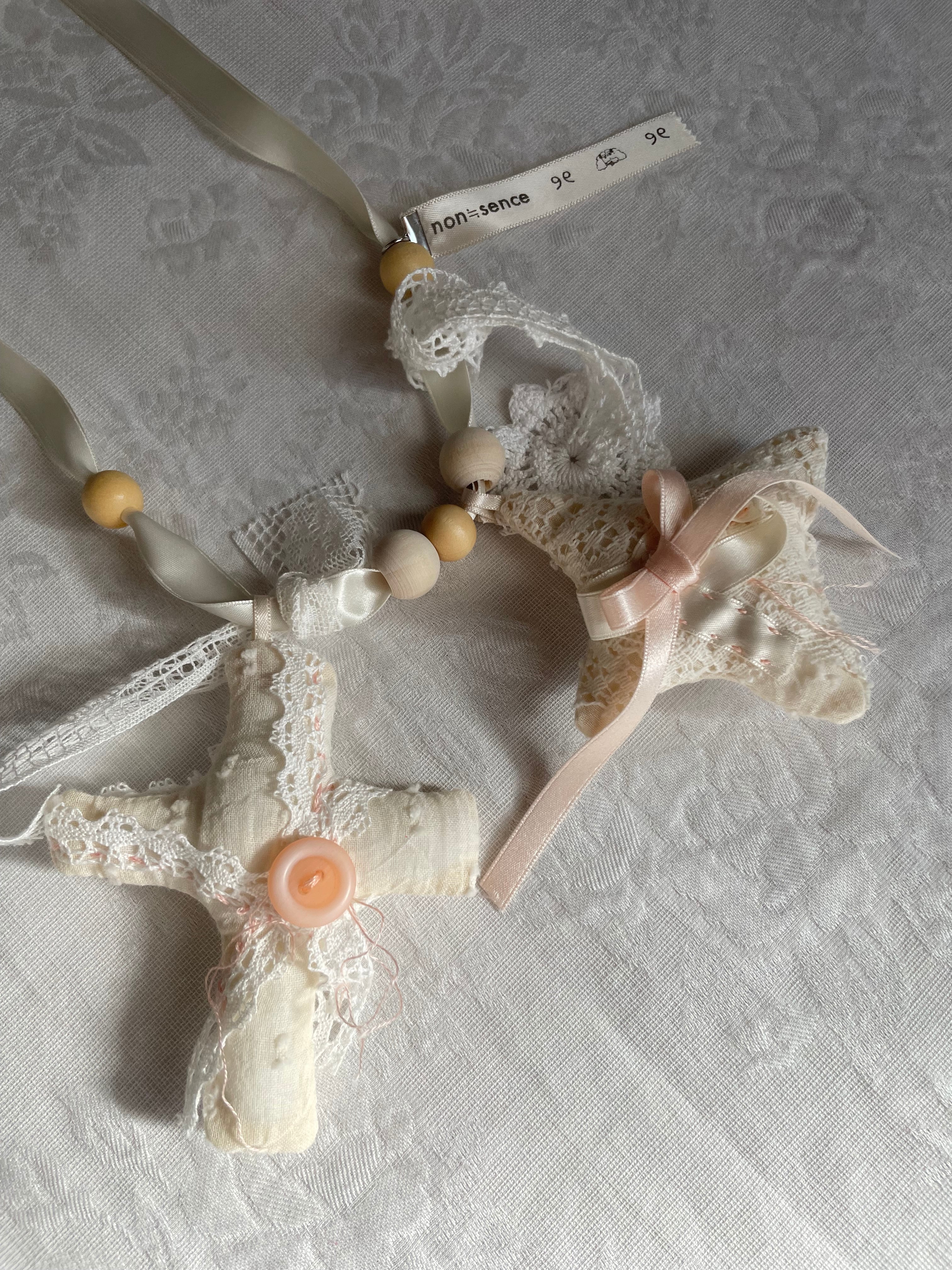 十字架と星のマークのお守りをつくって、リボンで繋いで、仕立てました。