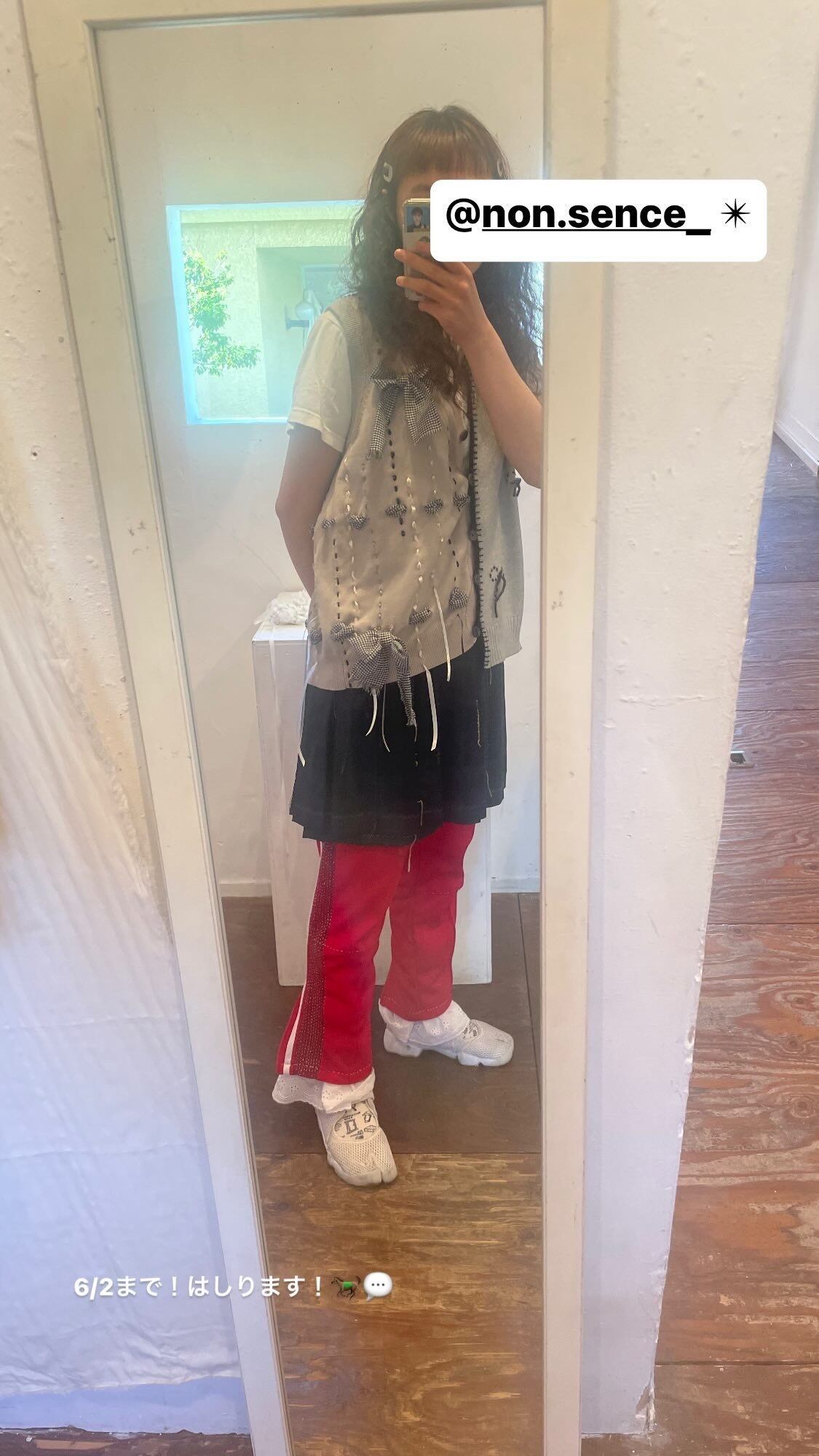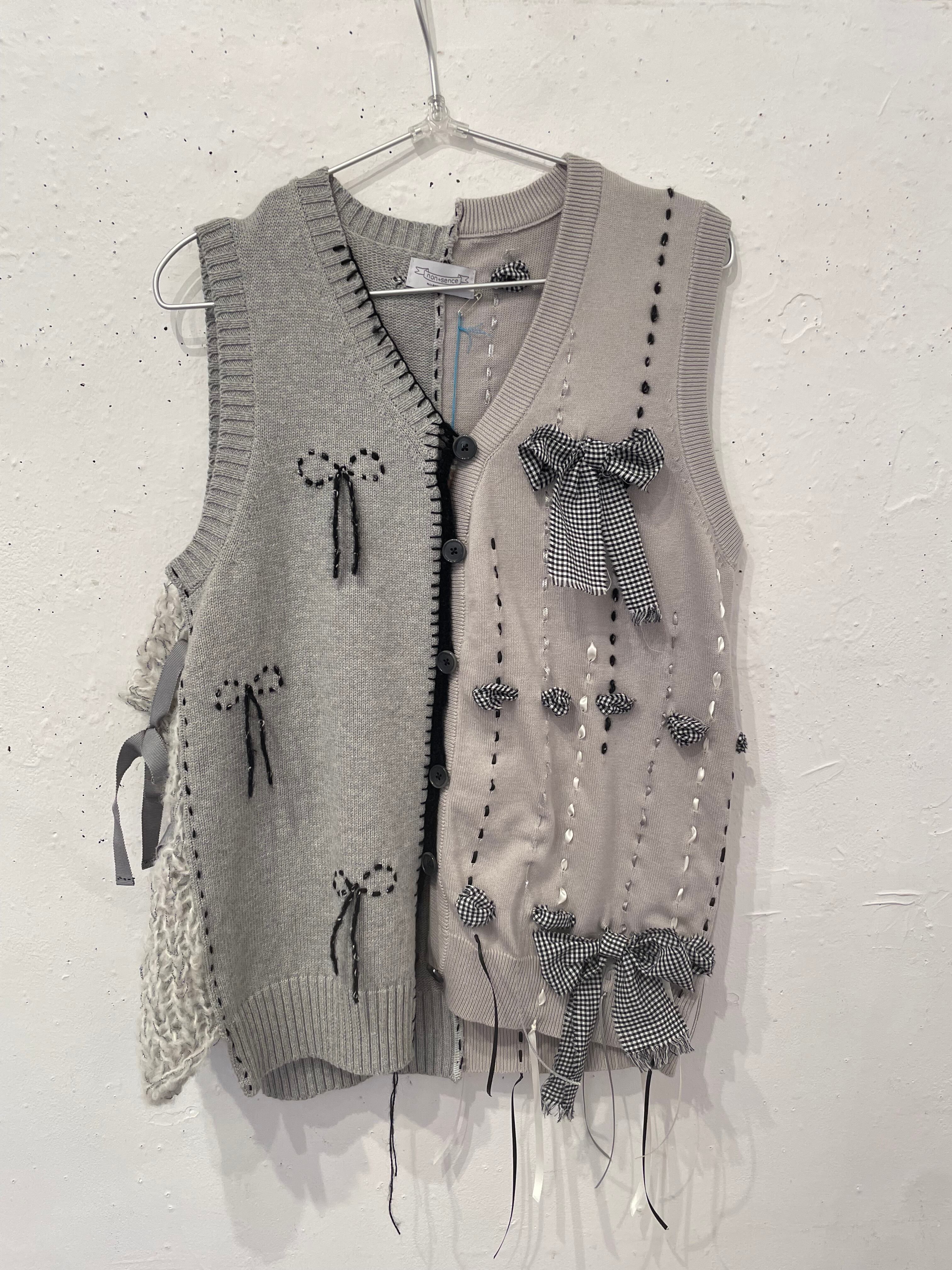 カタチやサイズの違う、スクールベストを繋げて、リボンで飾りつけ。