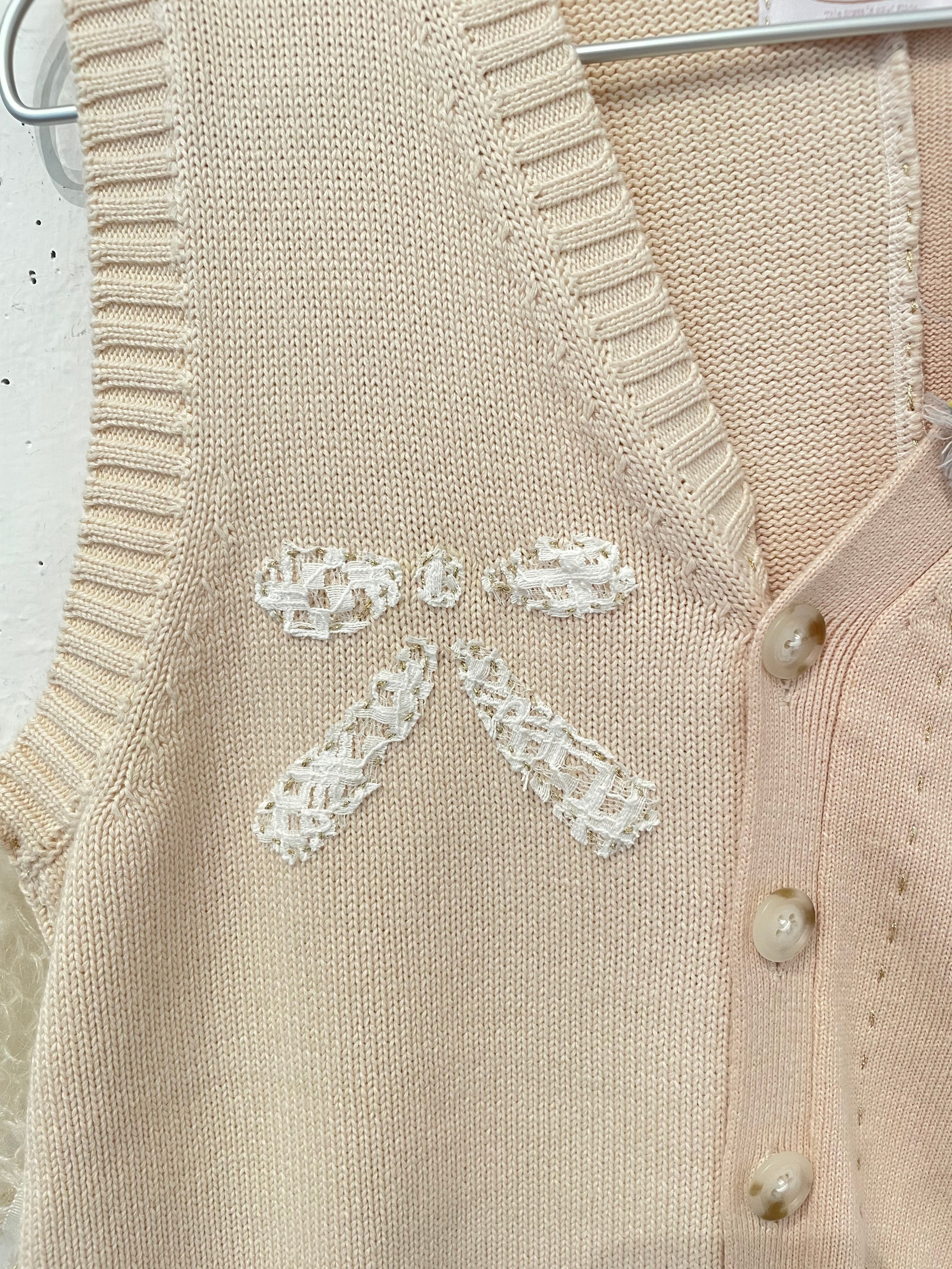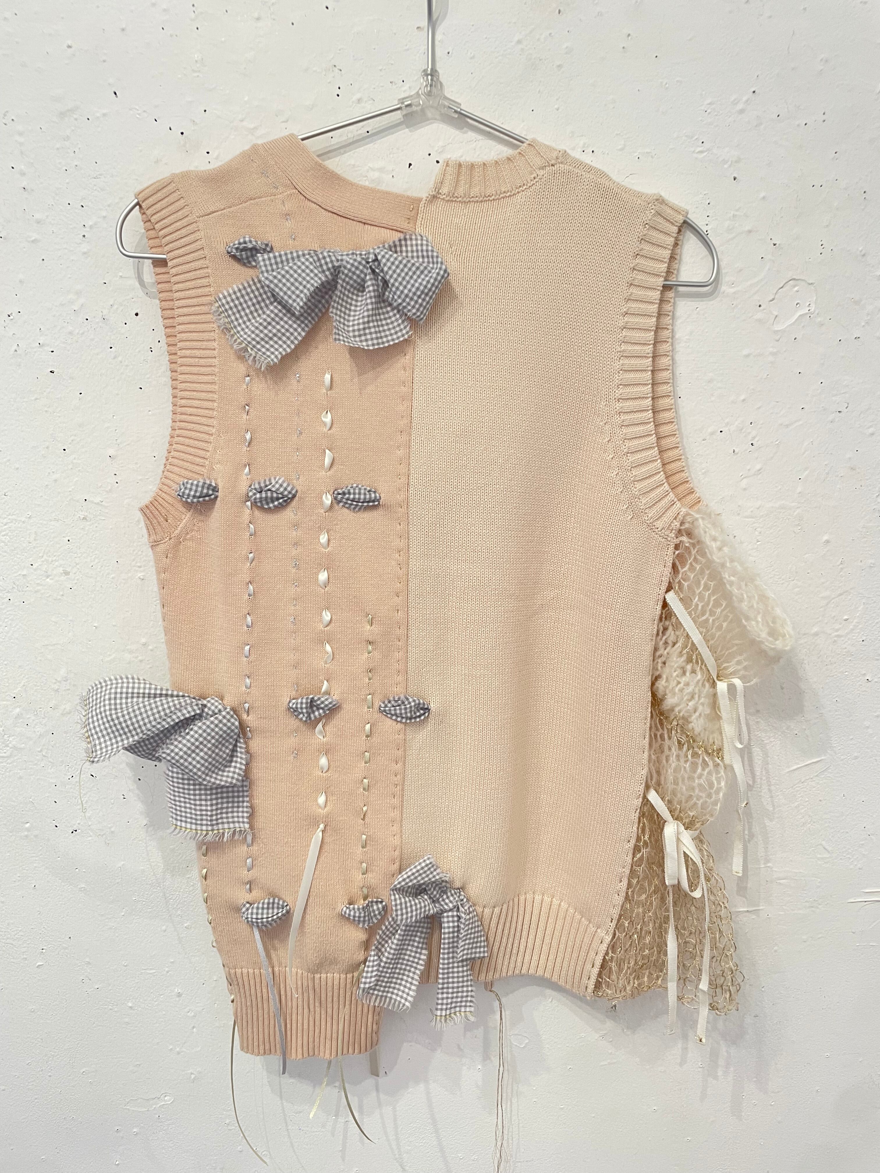 カタチやサイズの違う、スクールベストを繋げて、リボンで飾りつけ。